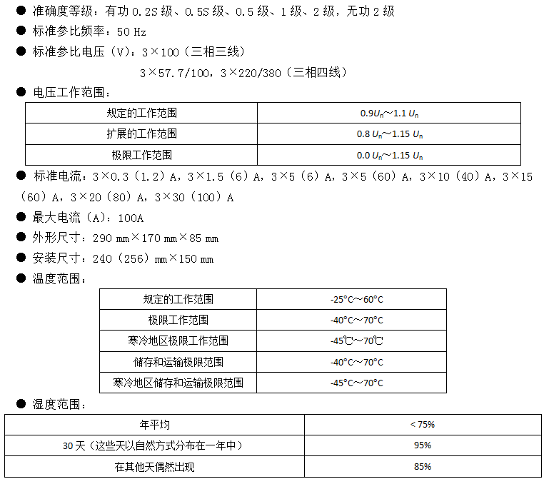 ● 多费率:具有2套时区表,2套日时段表,可设置14个时区,14个日时段,4费率。● 计量:具有总及分相有功正反向计量功能,总无功及分相四象限计量功能,并可设置有功和无功组合电能量,长期工作不须调校,精确度高,能测量实时电压、电流、功率因数,可用软件对误差进行调校。● 需量:总及分相、分时段有功无功最大需量及发生时间。● 计时:具有日历、计时、闰年自动转换功能;内部时钟端子输出频率为1Hz。在-25~+60℃温度范围内,时钟准确度随温度的改变量小于0.1s/(d℃),在该温度范围时钟准确度≤±1s/d;在参比温度(23℃)下,时钟准确度≤±0.5s/d。● 数据存储:能存储12个结算日电量,12个结算日最大需量,60次定时冻结电量,62天日冻结电量,254次整点冻结电量,3次瞬时冻结电量,负荷记录能存储间隔1分钟不少于40天的数据量。● 事件记录:失压记录、断相记录、失流记录、全失压记录、电压(流)逆相序记录、潮流反向记录、恒定磁场干扰记录、需量清零记录、过载记录、校时记录,编程记录,清零记录,开盖记录、电源异常记录。● 具有红外、RS485通讯方式,可对数据进行查询及对参数进行设置。● 具有液晶及背光显示功能,并具有停电显示及唤醒功能,停电可抄表…